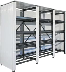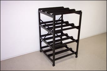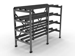 Багатоярусні стелажі призначені для встановлення герметизованих батарей у вертикальному та горизонтальному положенні. Вони зручні для монтажу та демонтажу завдяки тому, що основними компонентами конструкції є бічні багаторівневі опорні елементи та профільні балки.