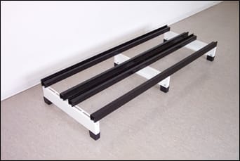 Дворівневі стелажі складаються з однорівневих секцій зі стійками. Стійки виготовлені зі сталевого профілю прямокутного перерізу 50х30 мм, який покритий порошковою кислотостійкою епоксидною емаллю. Для забезпечення жорсткості дворівневого стелажа використовуються регульовані по довжині діагональні підкоси, що входять до стандартної комплектації стійок. Підкоси виготовлені зі сталевої смуги перерізом 30х3 мм і також покриті порошковою кислотостійкою епоксидною емаллю.